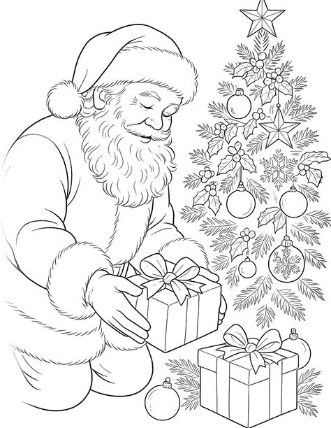 Santa By Christmas Tree Coloring Page - Digital Download 300 DPI JPEG - Holiday Line Art For Kids & Adults
