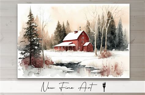 Farmhouse Winter Snow Barn Wall Art, Rustic Print, Red Barn, Country Landscape, Watercolor, Christmas, Museum Quality Canvas Or Art Print